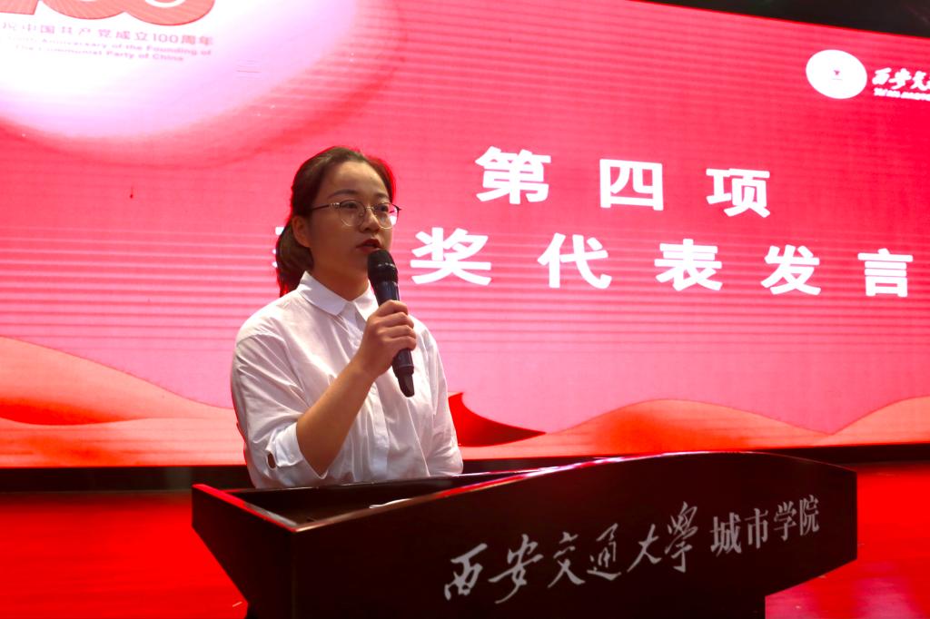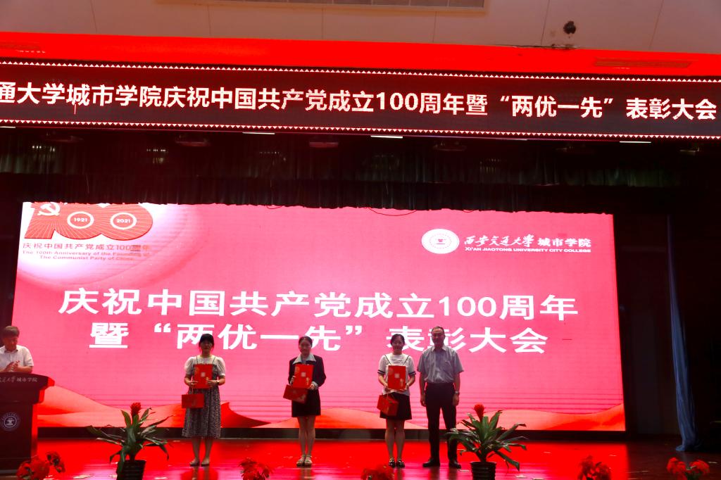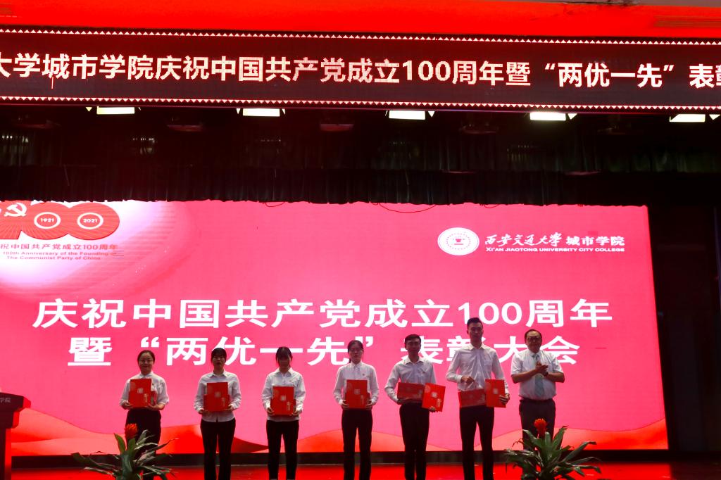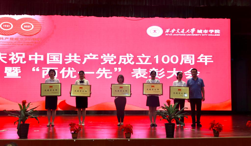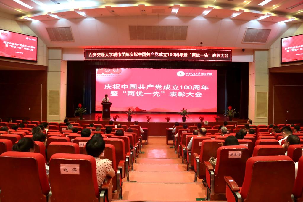 7月5日下午,西安交通大学城市学院庆祝中国共产党成立100周年暨“两优一先”表彰大会在教二报告厅举行。出席大会的有学院领导、党委委员、纪委委员、各系(教学部)、中心(部)副职及以上干部、各党支部书记、委员、受表彰的先进党支部代表、优秀共产党员、优秀党务工作者以及教职工和学生代表。大会由院长助理徐君陶主持。