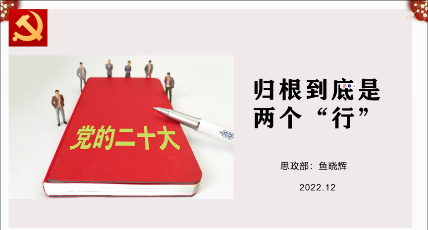 为深入学习贯彻党的二十大精神,129日下午,学院机关第六党支部、外语系教工党支部、外语系学生党支部在腾讯会议共同召开学习贯彻党的二十大精神宣讲报告会。本次报告会特邀思政部鱼晓辉老师主讲,外语系教工党支部与外语系学生党支部全体党员参加,会议由学院机关第六支部书记黄迎老师主持。