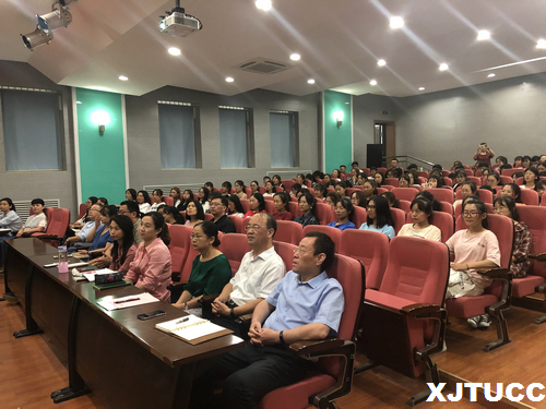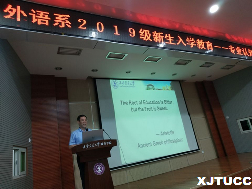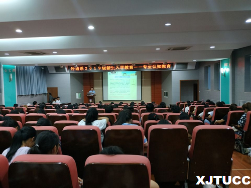 9月9日下午,西安交通大学城市学院外语系组织全体2019级新生在学院F100报告厅开展新生入学专题教育活动。外语系主任郭继荣教授,副主任赵永生副教授,主任助理徐素云老师,英语类专业和日语专业全体教师、班主任、辅导员以及2019级新生参加会议。外语系主任郭继荣教授为同学们做了专业认知教育专题讲座。