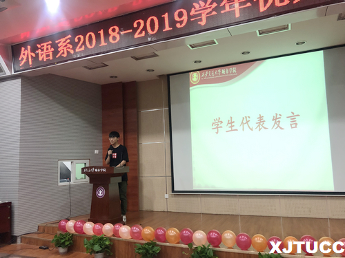大会伊始,由徐素云宣读表彰决定,并由赵永生等为此次大会获得学习标兵、学科竞赛及文体艺术标兵、专业四级考试优秀奖、进步突出优秀个人、优秀学生干部、优秀班级和优秀宿舍的学生颁奖。接下来由获得“学习标兵”及“学科竞赛标兵”称号的丁远同学代表获奖学生发言。丁远同学多次大类排名第一,并在第二十二届“外研社·国才杯”全国大学生英语辩论赛中获华西赛区三等奖,在2018“外研社杯”全国英语演讲大赛省级复赛中获陕西赛区二等奖。他结合自身参加经历,鼓励同学们多参加各项竞赛,敢于迎接挑战,以赛促学,通过与其他学校的同学同场竞技发现自身不足,不断提升自我能力。