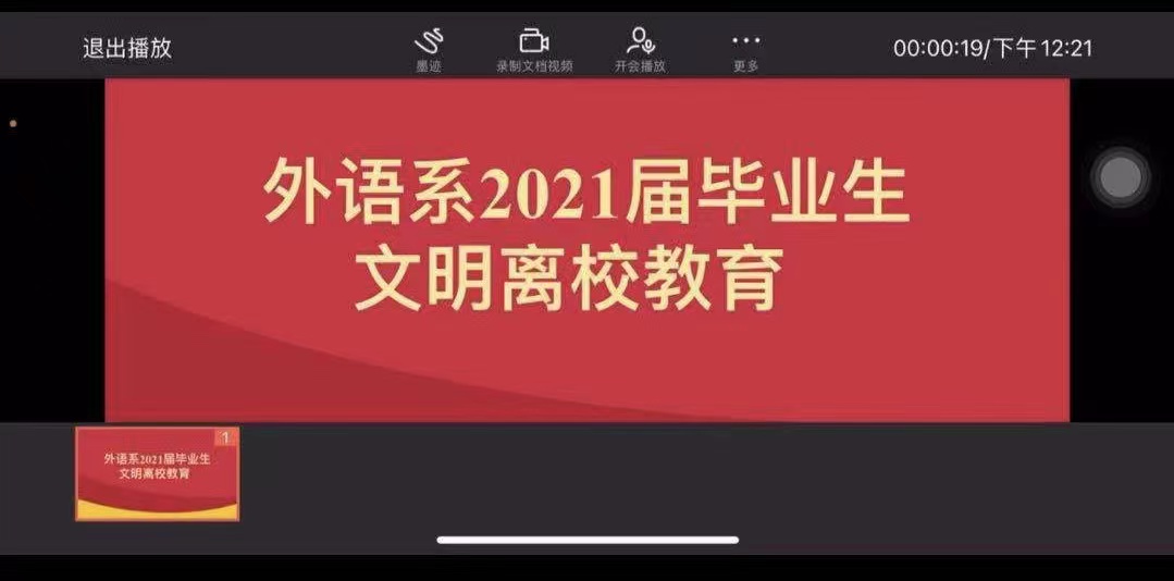 为做好2021届毕业生文明离校教育及就业服务工作,确保毕业生安全、文明、有序离校,外语系于5月10日至6月30日之间开展了走访毕业生学生宿舍、考研交流会、专四经验分享会、诚信资助主题教育班会、毕业生文明离校大会等一系列活动。