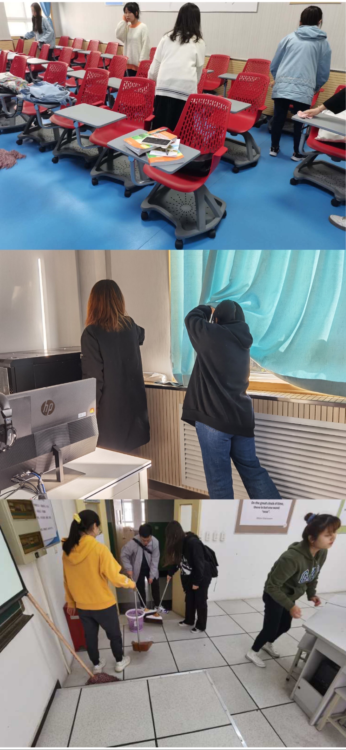 11月6日,外语系组织新生进行集体劳动锻炼,对教学楼B段外语系实验室进行彻底打扫。在打扫过程中,同学们对实验室的基本设施有一定的了解,明白了文明使用实验设备、自觉维护实验环境的个人责任。当日,外语系还特别邀请现任职于海南航空的外语系优秀毕业生为新生举办了“行为规范培养讲座”,从着装、妆容、礼仪、姿态等方面进行分享,指导新生在日常学习生活中注重文明礼仪、提高个人素养。