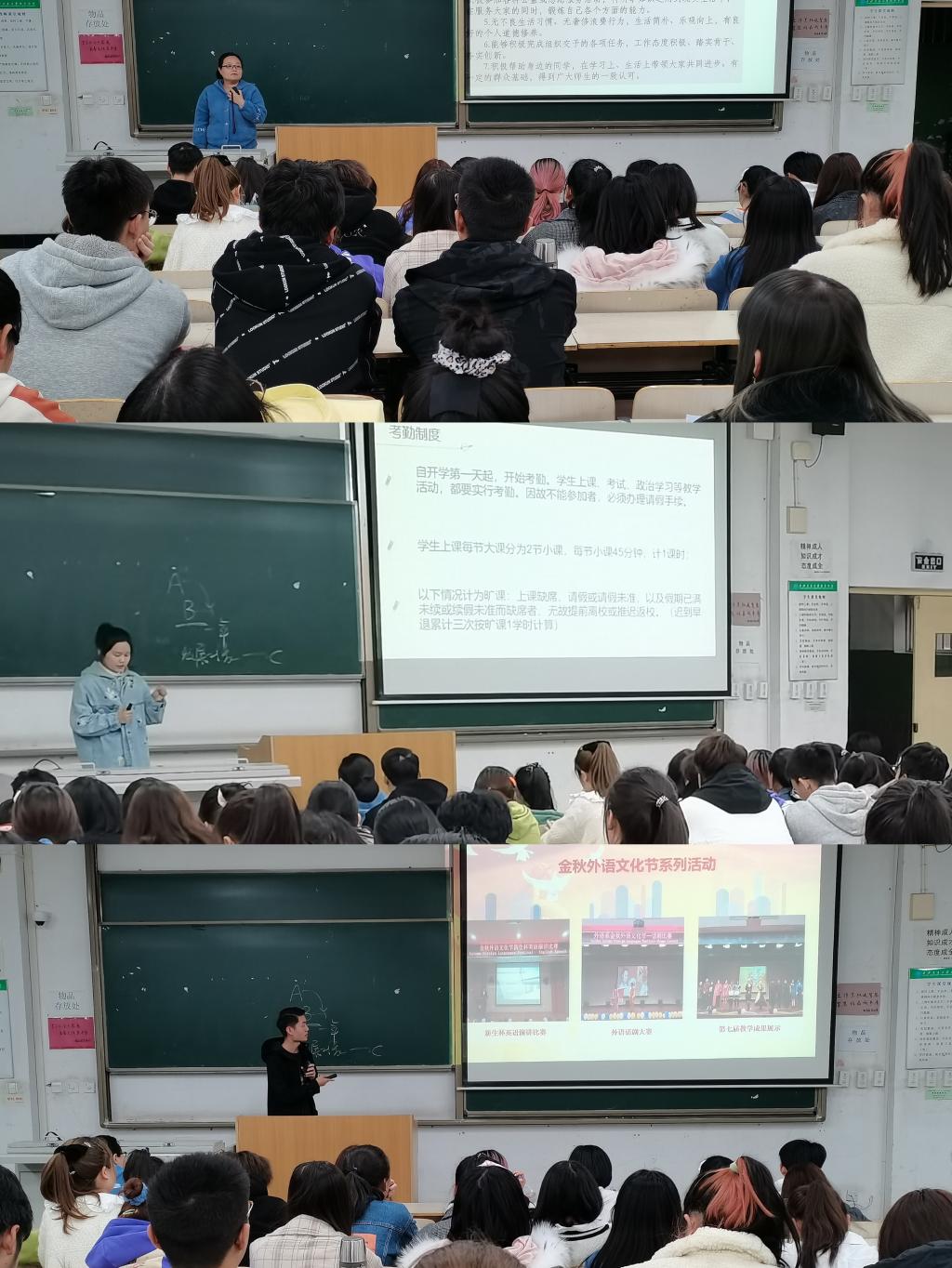 10月30日下午,外语系学工办张天、刘牧原、韩蓉三位老师在教学楼E200进行了党团教育、校纪校规教育以及课外十学分教育。他们的讲解帮助同学们了解了入党流程,激起了同学们积极向党组织靠拢的决心。他们还介绍了外语系团学组织和第二课堂活动,鼓励新生们积极参加团学组织、勇于展示自我,提高综合素质。