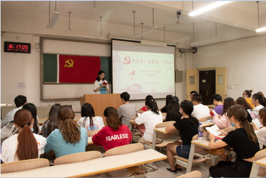 为了庆祝中国共产党建党99周年,西安交通大学城市学院外语系、传播系学生党支部于7月1日下午16点在教学楼D107开展了主题为“学党章、温誓词、守初心”的“七·一”建党节特色活动。本次活动由党支部书记张天主持,组织委员杨耀聪、宣传委员刘牧原以及党支部全体党员共同参与。