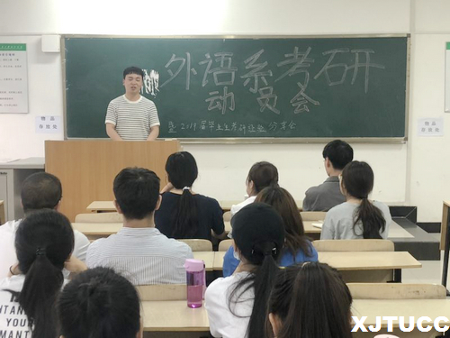 为调动外语系学生考研积极性,对外语系学子进行考研鼓舞动员,使同学们更好地挖掘自身潜能, 5月21日晚,外语系在C308教室召开了2020届外语系考研动员会暨2019届毕业生考研经验分享会,外语系副主任赵永生副教授出席并作了动员讲话,会议邀请毕业生康孟超和周彤作考研经验交流。外语系立志考研的50余名学生到场参会。