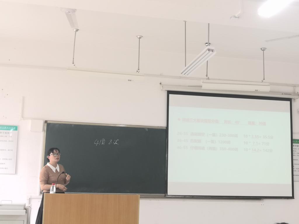 随后,王佩老师关于四级阅读模块进行示范课展示。在示范课中,王佩老师首先提出让学生做限时训练的必要性,使学生更好地把握考试时间。在四级阅读教学方法的讲解中,王老师强调要注重课程设计,把握好课时分配和题型分类讲解,如主旨题,细节题,例证题等。另外,借助阅读题不同题型,提出具体而有步骤性的做法,读后需要监督学生强化练习重点,提高学习效率。示范课后,巫老师肯定了王佩老师的教学方法,并进一步强调在教学过程中,每节课都需重视整体教学环节的设计。