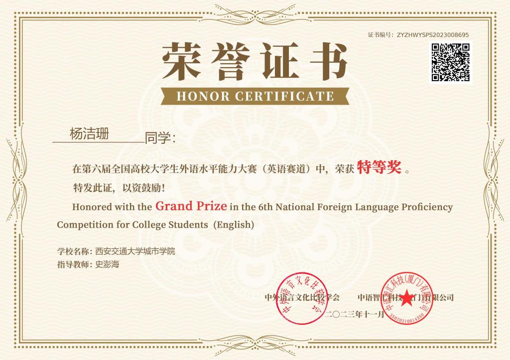 近日,第六届全国高校大学生外语水平能力大赛落下帷幕,外语系学生共13人获奖,其中参加英语赛道的吴佳星、杨洁珊荣获特等奖,王海伊等3人荣获一等奖;参加日语赛道的姚乐恒等8人荣获三等奖;外语系教师史澎海、吴夫迎、樊华、吐雅荣获“优秀指导老师奖”,西安交通大学城市学院荣获“最佳院校组织奖”。
