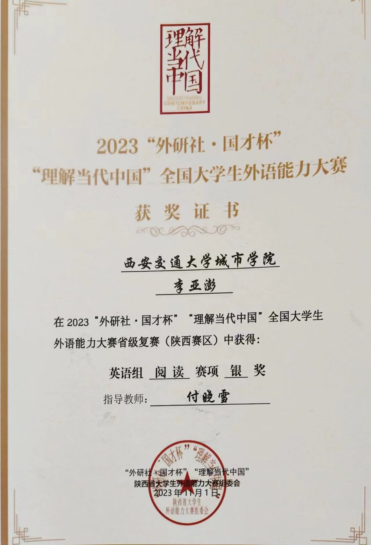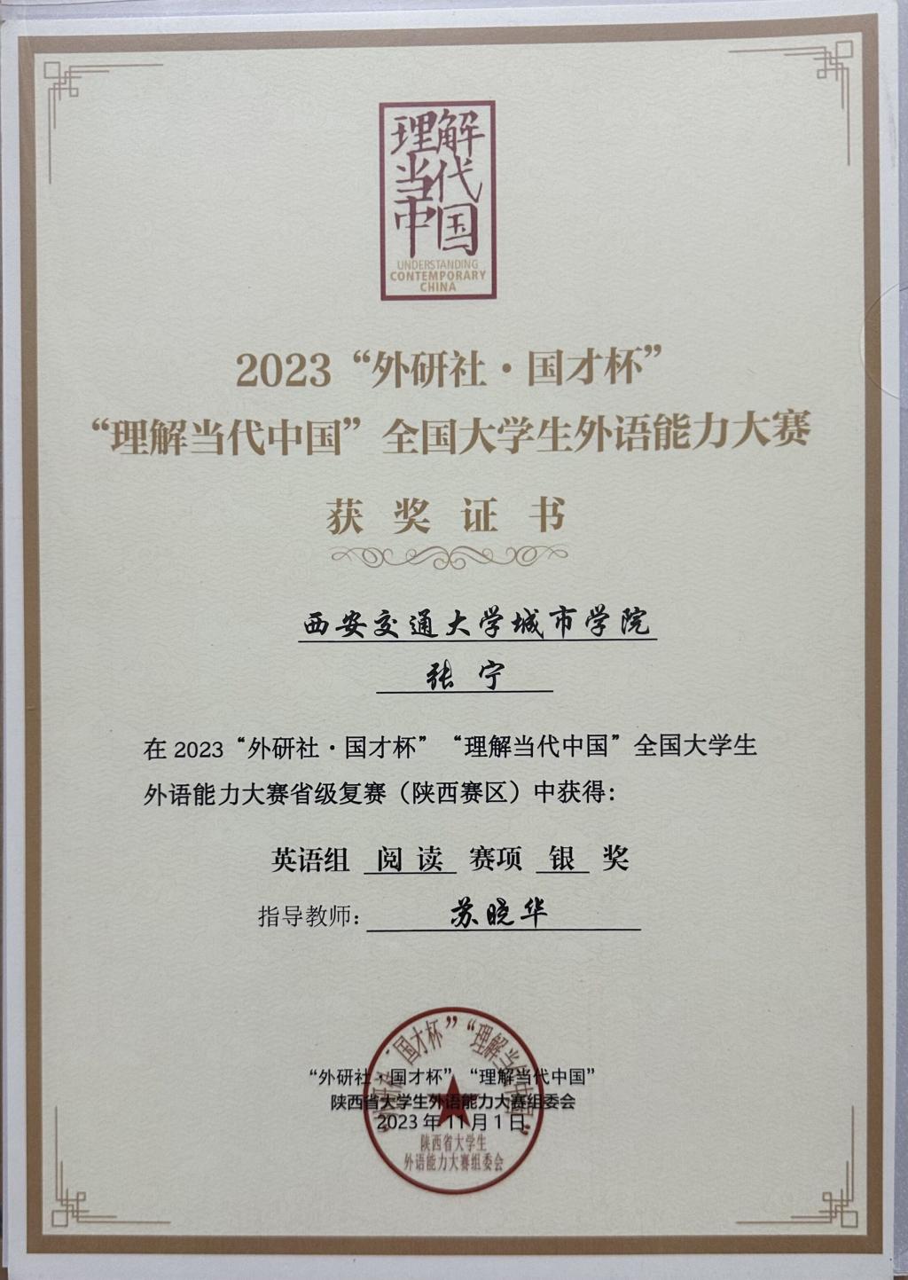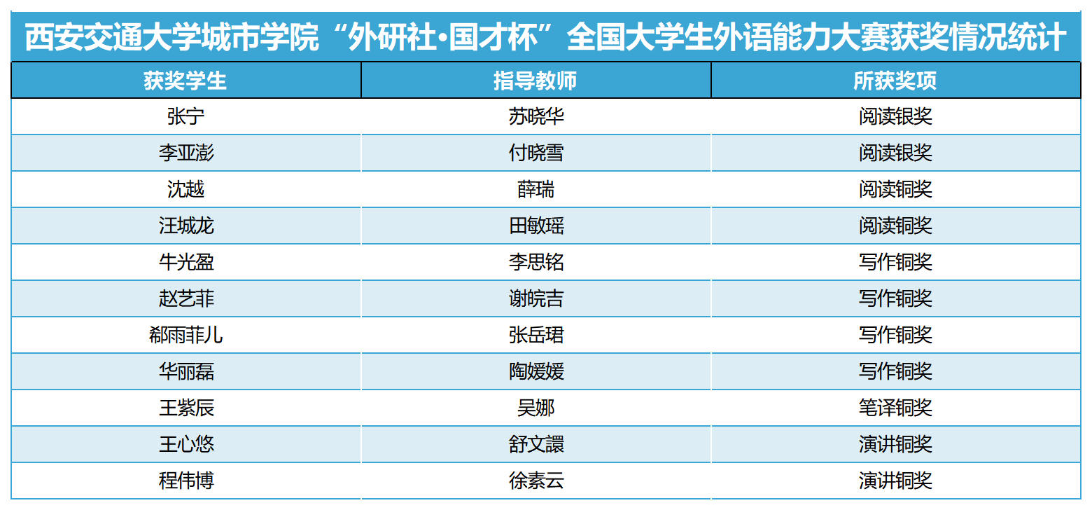 近日,以“理解中国,沟通世界”为主题的2023“外研社·国才杯” “理解当代中国”全国大学生外语能力大赛在西安外国语大学举行。前期经过校内评比,我校推选11名学生参加英语组四项赛事的角逐,最终获得陕西省复赛银奖2项、铜奖9项。