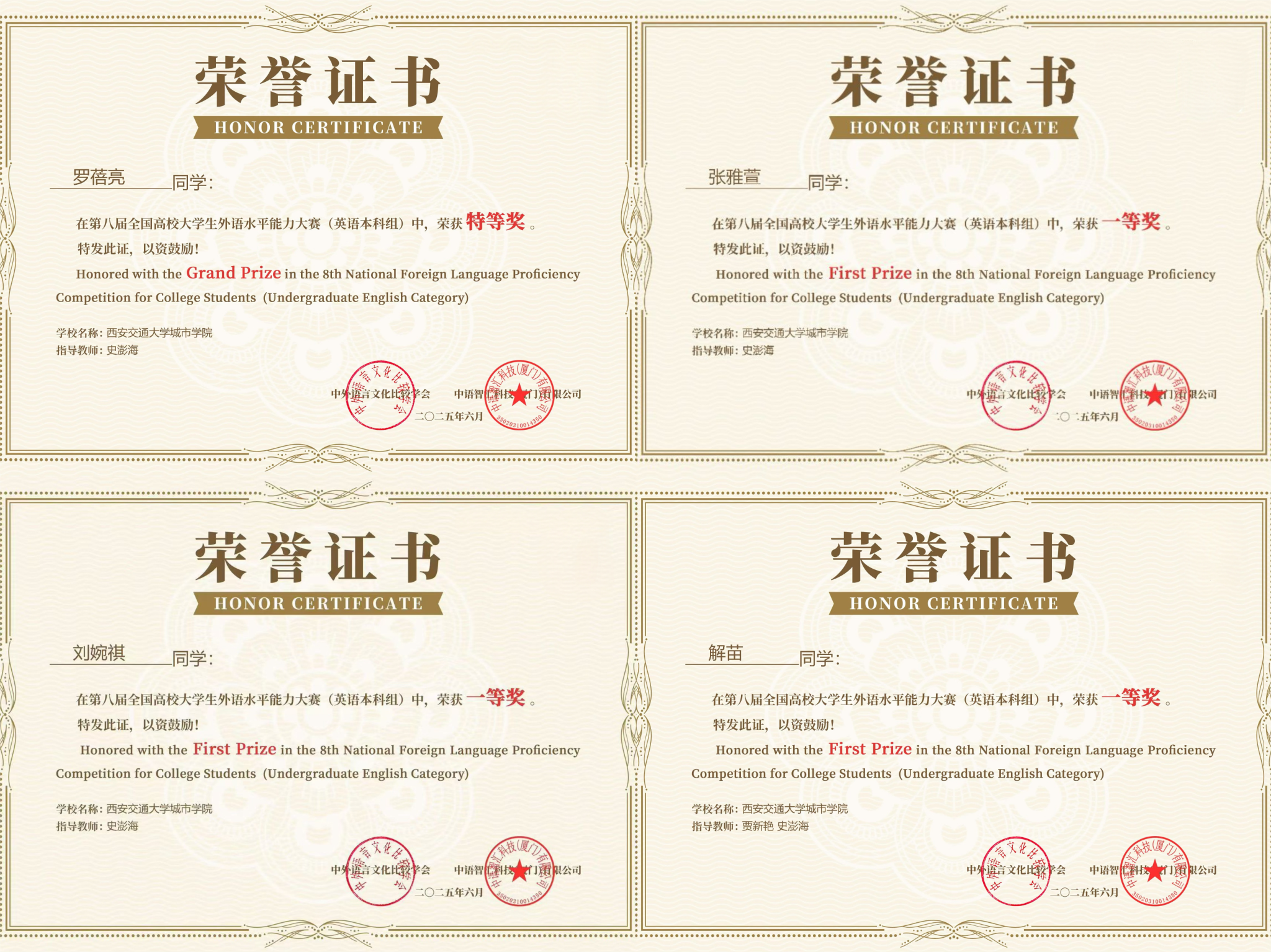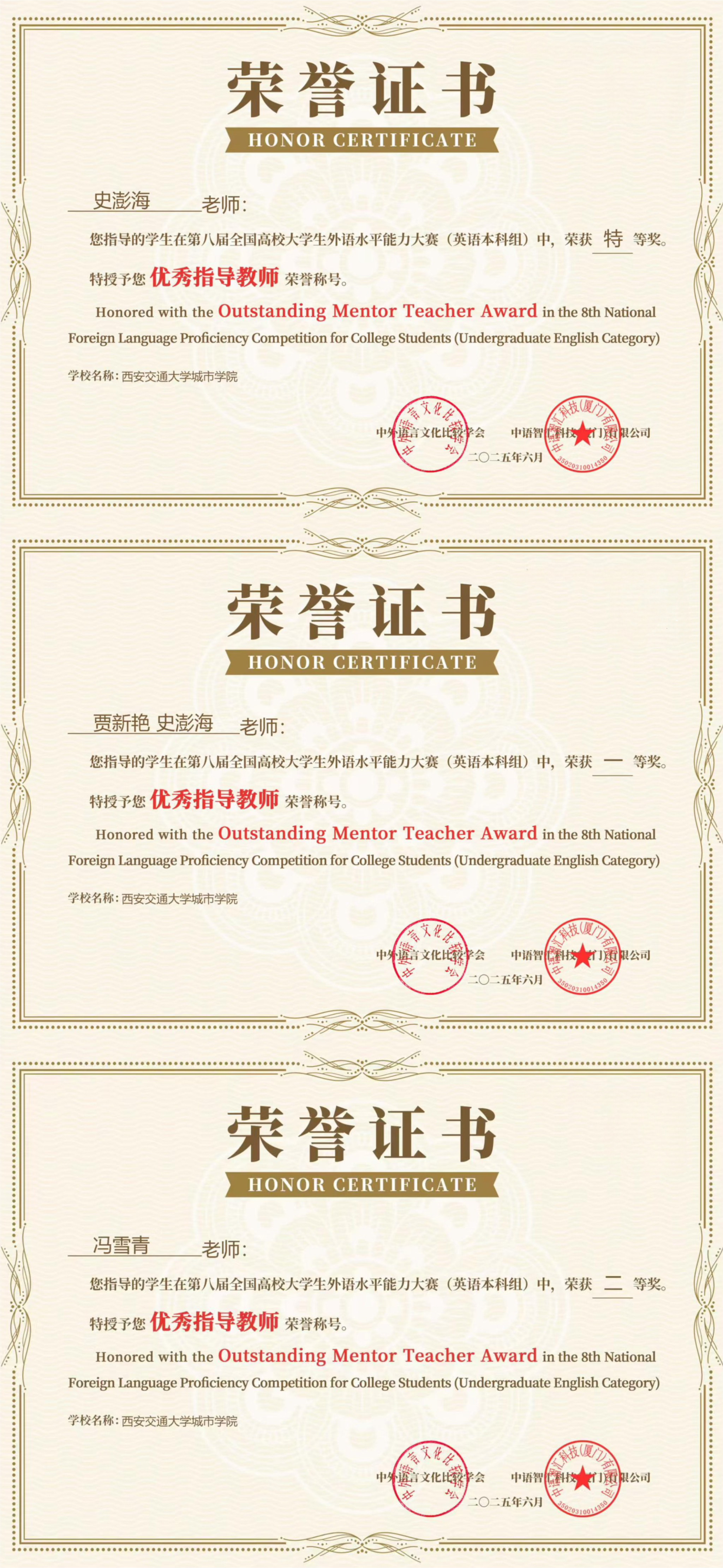 近日,第八届全国高校大学生外语水平能力大赛结束,西安交通大学城市学院获“最佳院校组织奖”,我校学生在英语本科组决赛中获特等奖1名、一等奖3名、二等奖2名、三等奖1名,在大学英语组决赛中获特等奖、一等奖、二等奖各1名。最美女人体内射精一区二区史澎海、贾新艳、冯雪青三位教师获“优秀指导老师奖”。