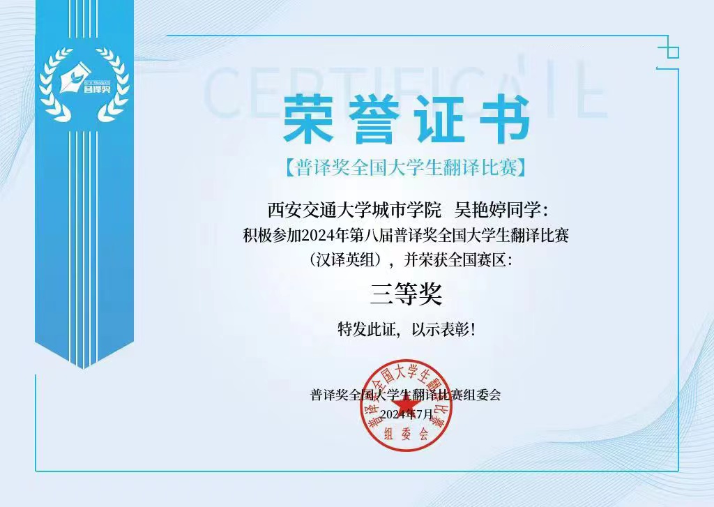 自3月中旬比赛报名始,我校外国语学院作为赛事协办单位就密切关注比赛进程并有序组织赛事宣传。比赛期间,外国语学院英语专业学生发挥出色,吴艳婷同学荣获汉译英组全国赛三等奖,蔡政熹、李晓楠同学荣获英译汉组全国赛三等奖。